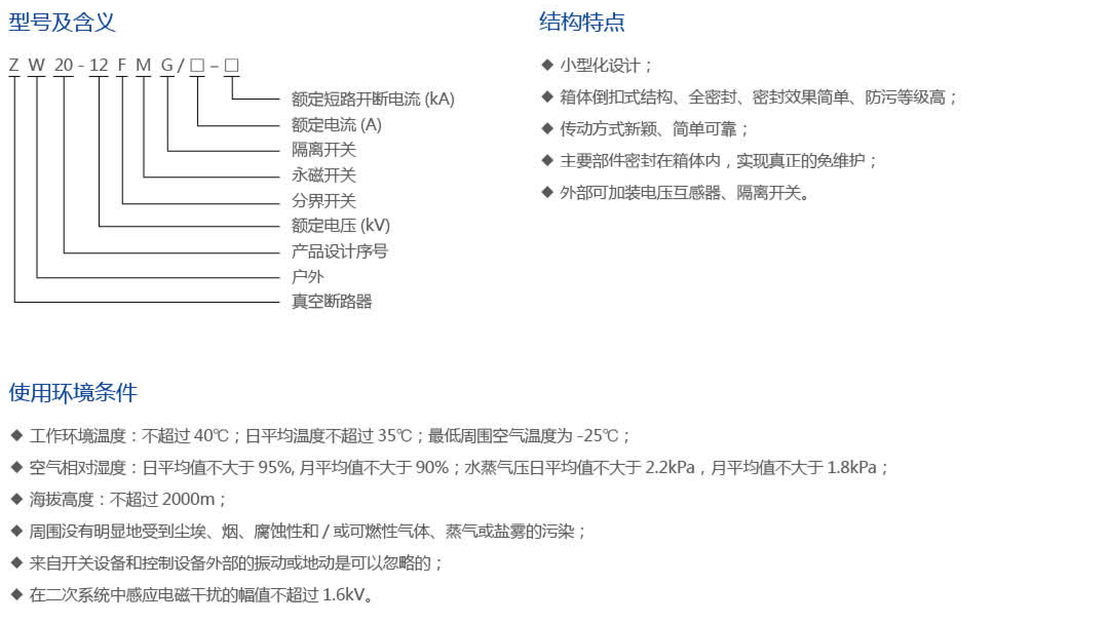 ZW20-12F(M)戶外高壓智能(永磁)真空斷路器為額定電壓12kV、三相交流50/60Hz的戶外高壓開關設備。主要用于開斷、關合電力系統的負載電流、過載電流及短路電流。