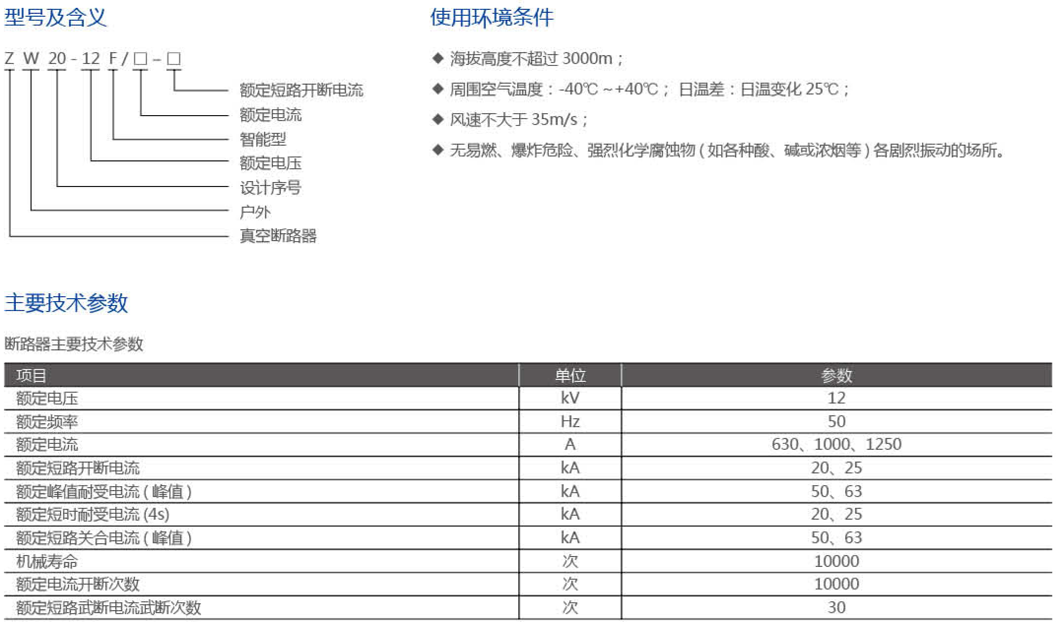ZW20-12F戶外高壓智能分界真空斷路器為額定電壓12kV、三相交流50Hz的戶外高壓開關設備。主要用于開斷、關合電力系統的負載電流、過載電流及短路電流。
