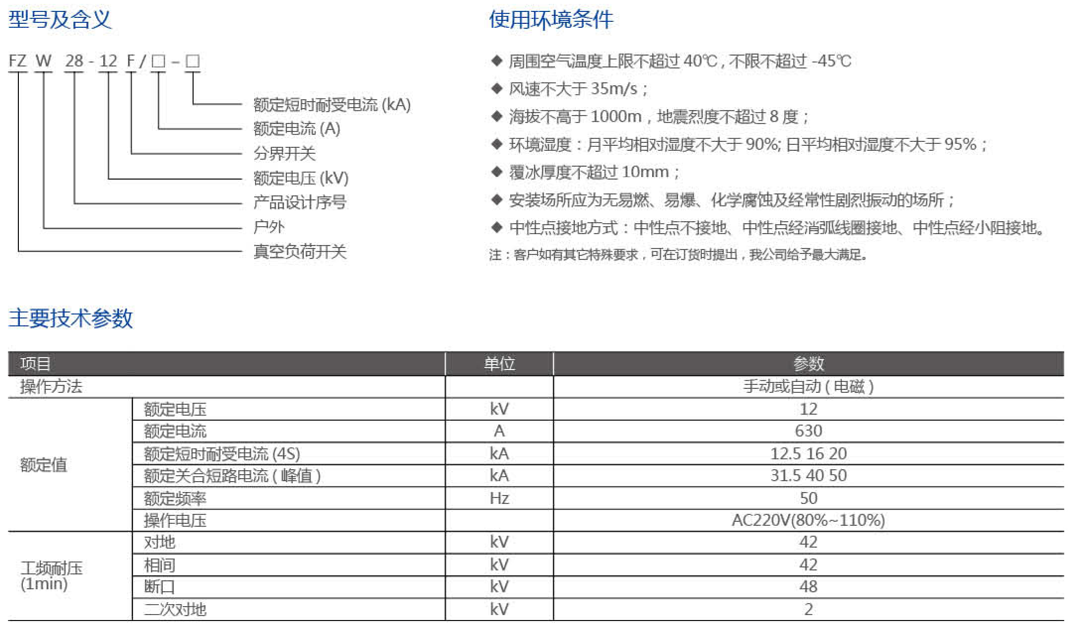 FZW28-12F戶外分界真空負荷開關(簡稱分界開關)使用于戶外柱上安裝的場合,具有手動合電動操作功能。開關本體采用引進日本東芝公司VSP5-12技術,本開關為免維護負荷開關。采用真空滅弧和SF6氣體作對地及相間絕緣介質。