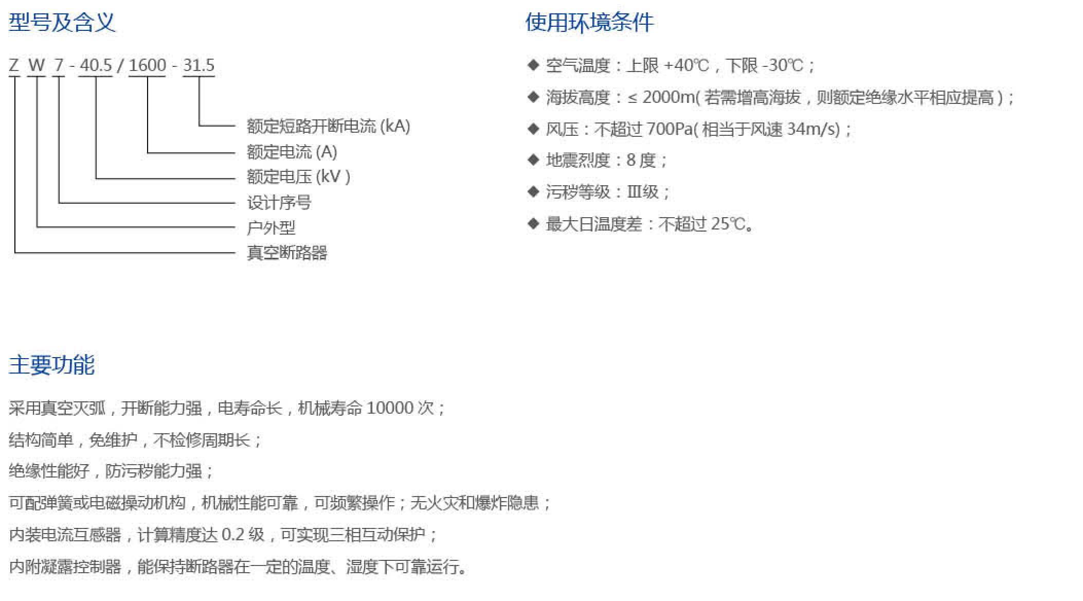 ZW7-40.5型戶外高壓真空斷路器用于交流50Hz 、額定電壓為40.5kV的三相電力系統(tǒng),作為分?jǐn)唷㈥P(guān)合負荷電流、過載電流及短路電流之用。