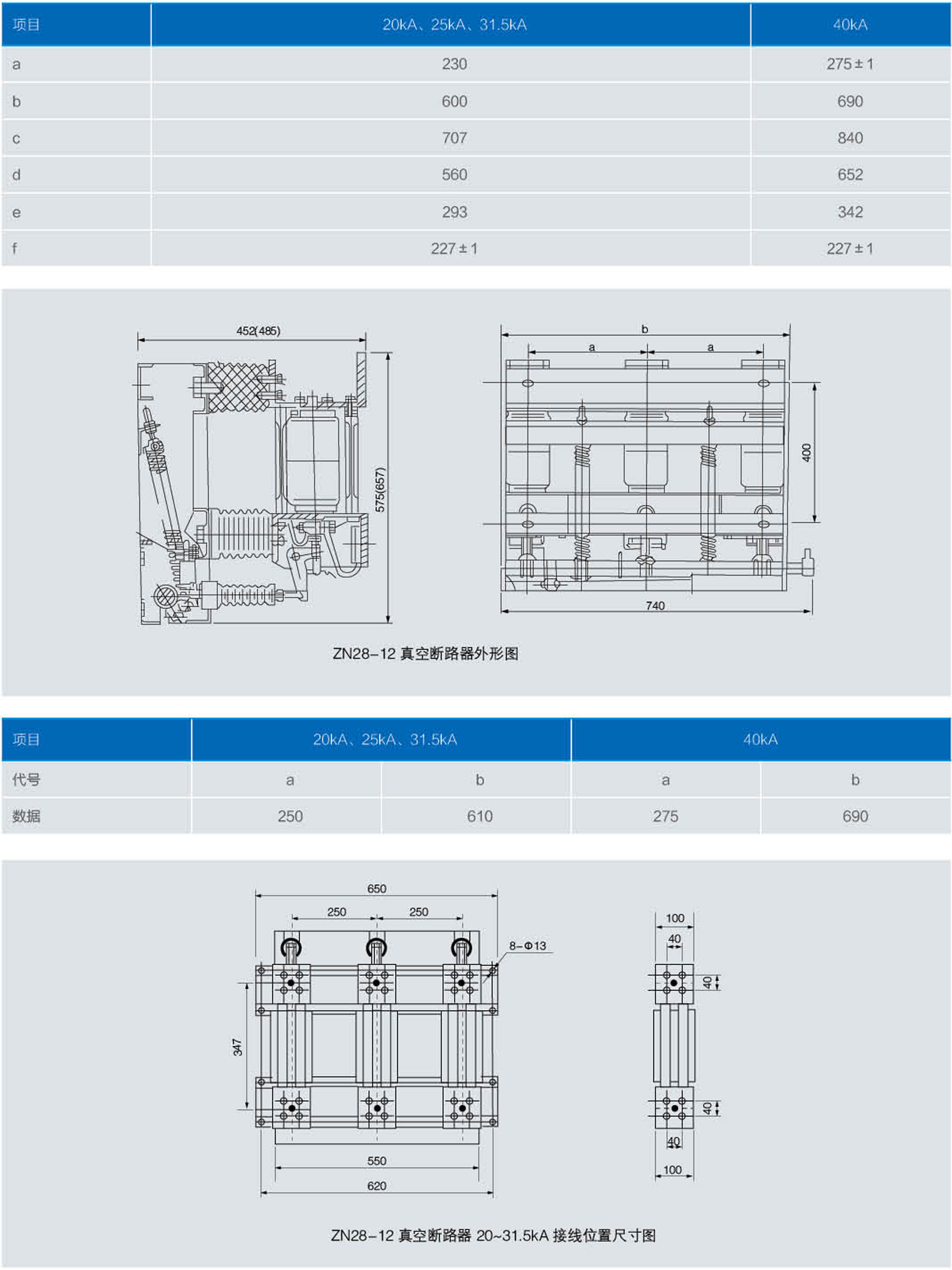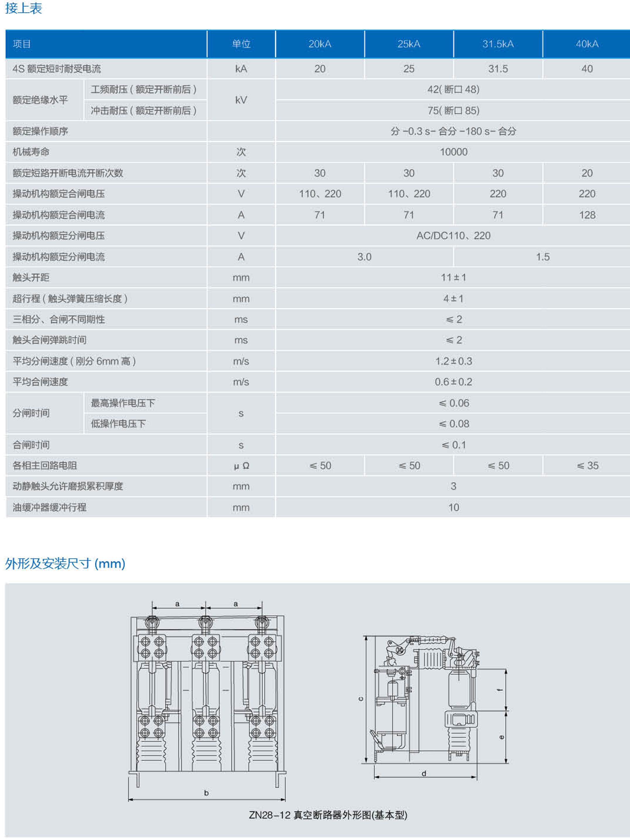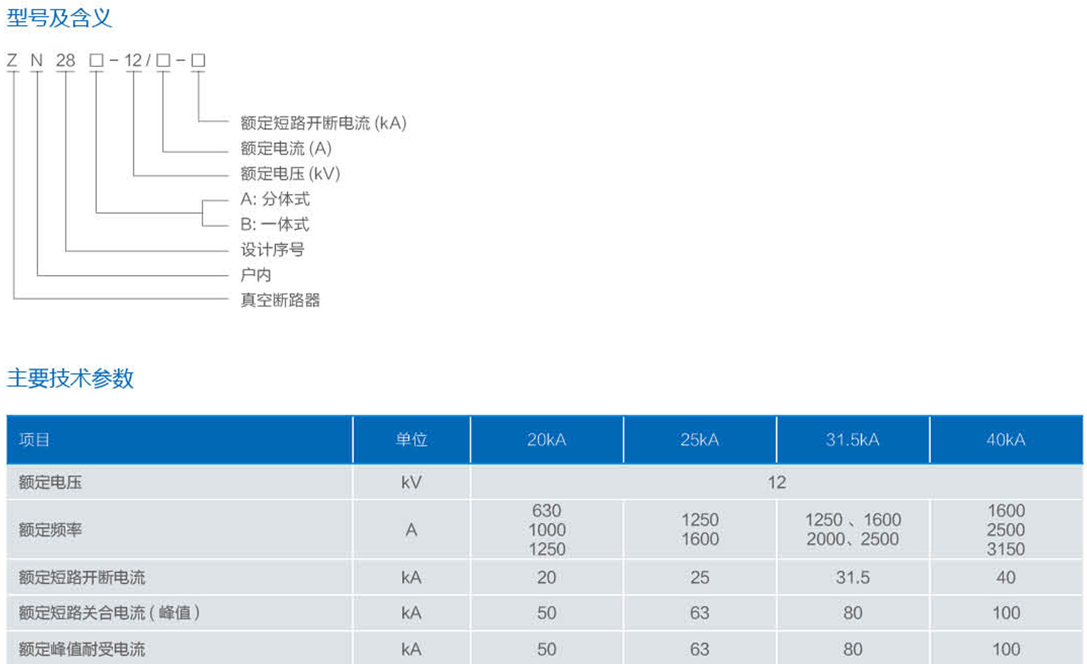 ZN28-12系列戶內高壓真空斷路器為額定電壓12kV,三相交流50Hz的高壓戶內開關設備。該產品符合B1984-89標準,該產品總體結構為開關本體與操動機構一體安裝和開關本體與操動機構分離安裝兩種形式。一體式結構即為ZN28-12基本型;分體式結構為ZN28A-12型,適用于固定式開關柜,如GG-1A(Z) , XGN2等。