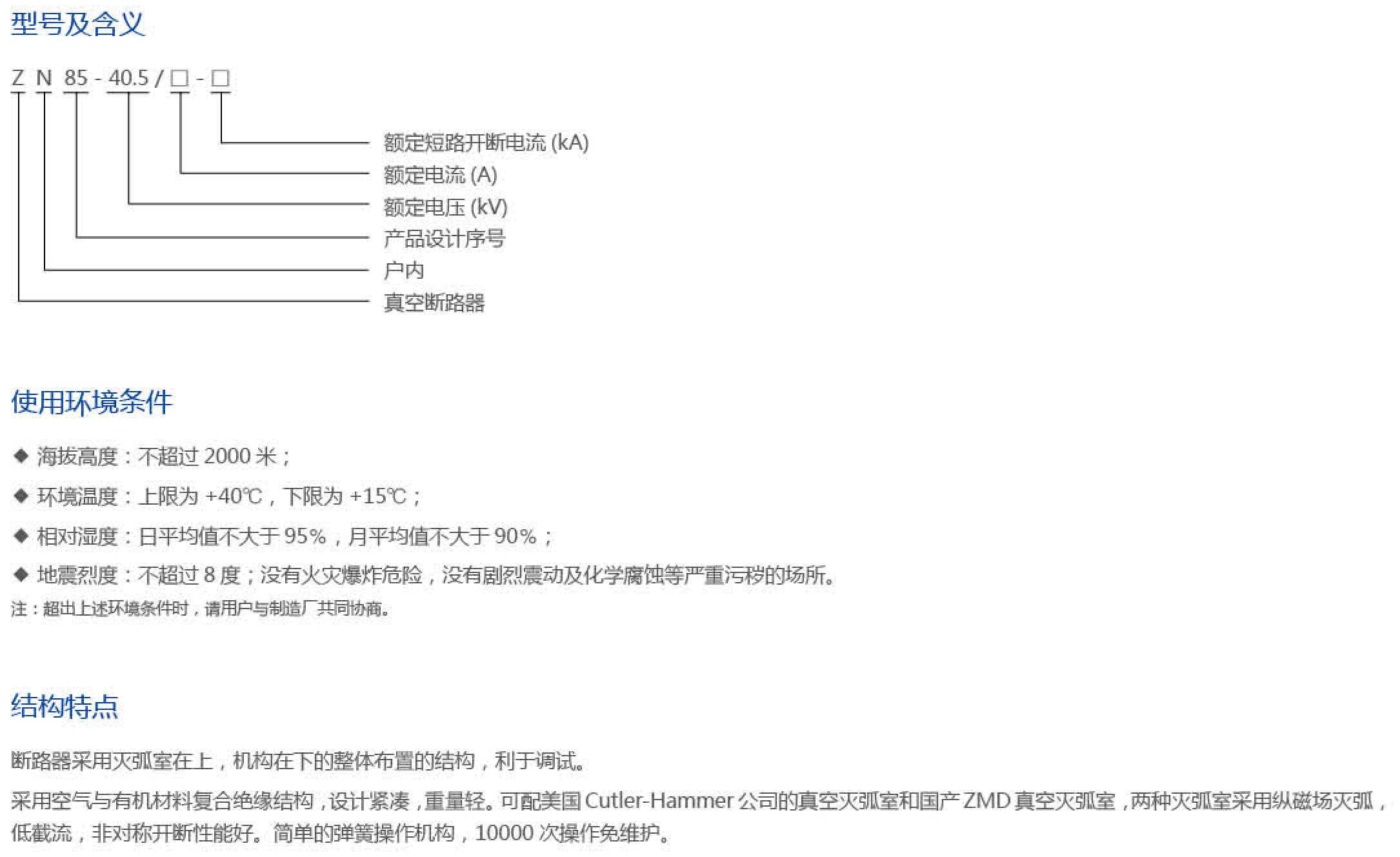 ZN85-40.5戶內高壓真空斷路器適用于三相交流50Hz、40.5kV系統中,可供工礦企業、發電廠及變電站作為分合負荷電流、過載電流故障電流之用,并適用于頻繁操作場合。本斷路器采用上下布置結構,有效地降低斷路器的深度。并采用復合絕緣結構、三相滅弧室和相聯帶電體由三只獨立的環氧樹脂絕緣罩殼相隔離,采用復合絕緣結構之后,斷路器滿足正常運行條件下的空氣距離和爬距要求,并有效地減少了斷路器的體積,主導電回路真空滅弧室和動靜導電聯接安裝在絕緣筒內,使相間僅為300mm。主回路電氣連接全部采用固定連接具有很高的可靠性。