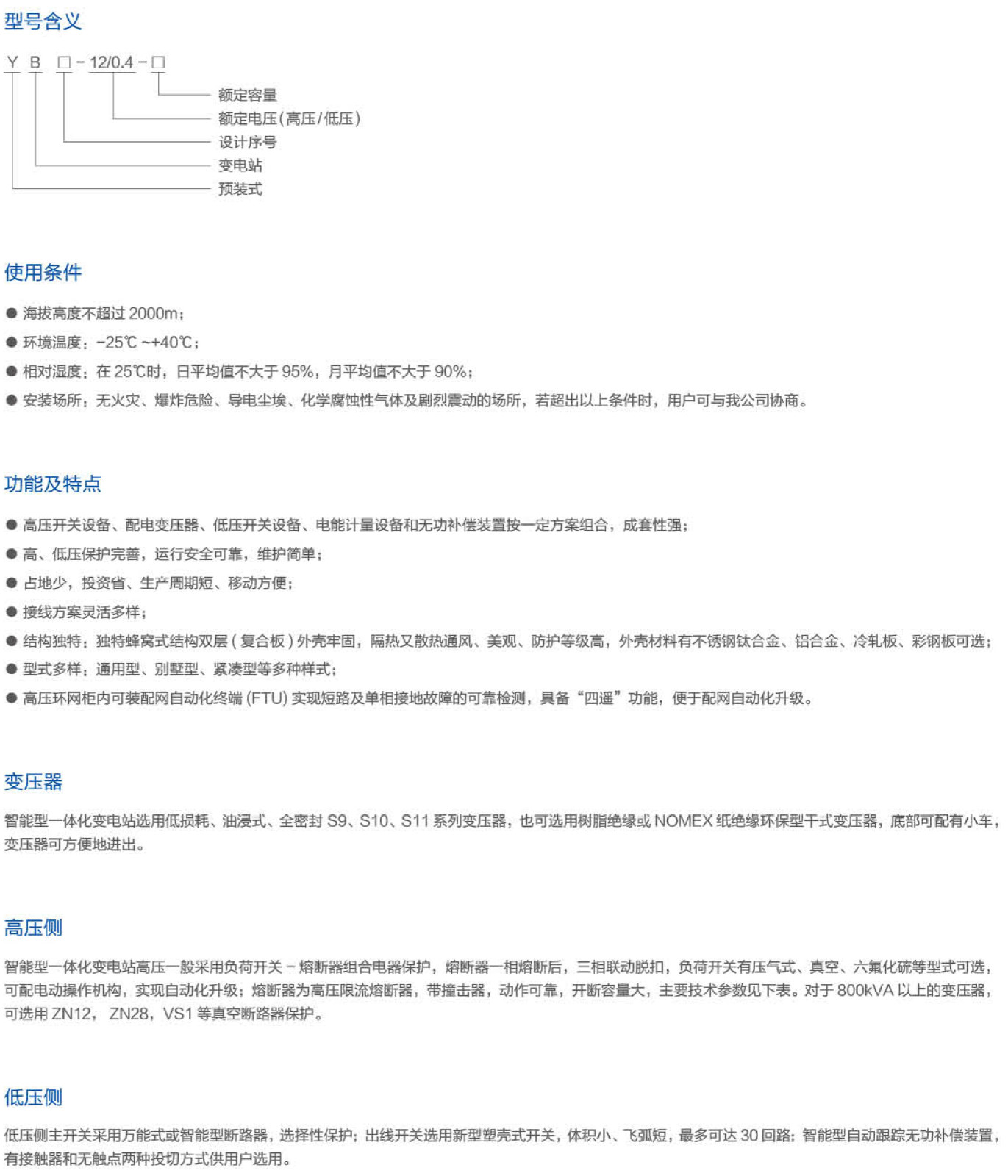 YB□-12/0.4(F·R) 高、低壓預裝式變電站(歐式)廣泛用于城市電網改造、住宅小區、高層建筑、工礦、賓館、商場、機場、鐵路、油田、碼頭、高速公路以及臨時性用電設施等戶內外場所。